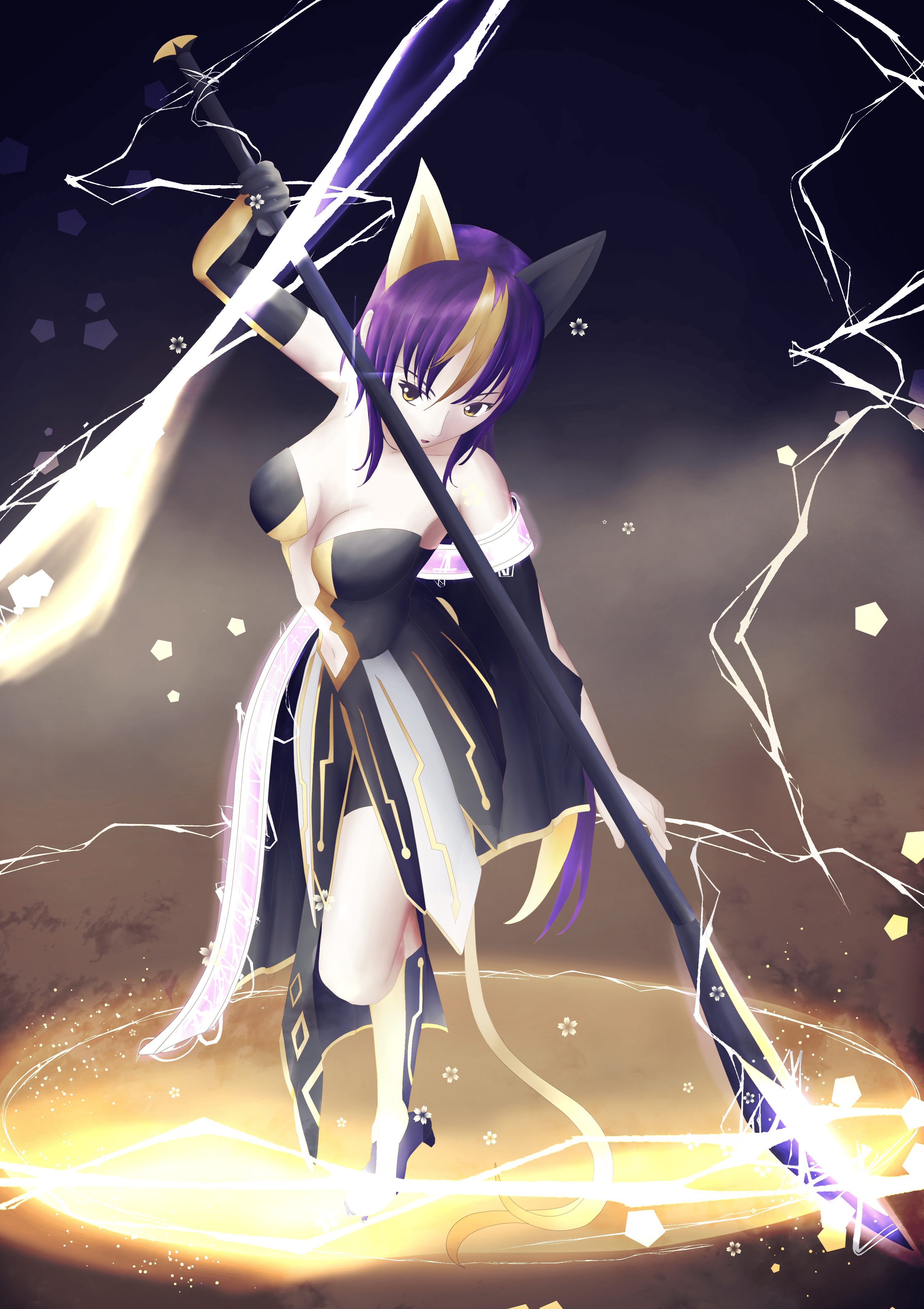 自然界のマナを雷の精霊の力で凝縮し纏った姿。迅雷の力を宿すこの衣は最も素早く敵を追い詰める。雷の力を溜めて帯電状態になることで落雷や攻撃範囲が拡大することができ、雨の天候とは相性が良い。