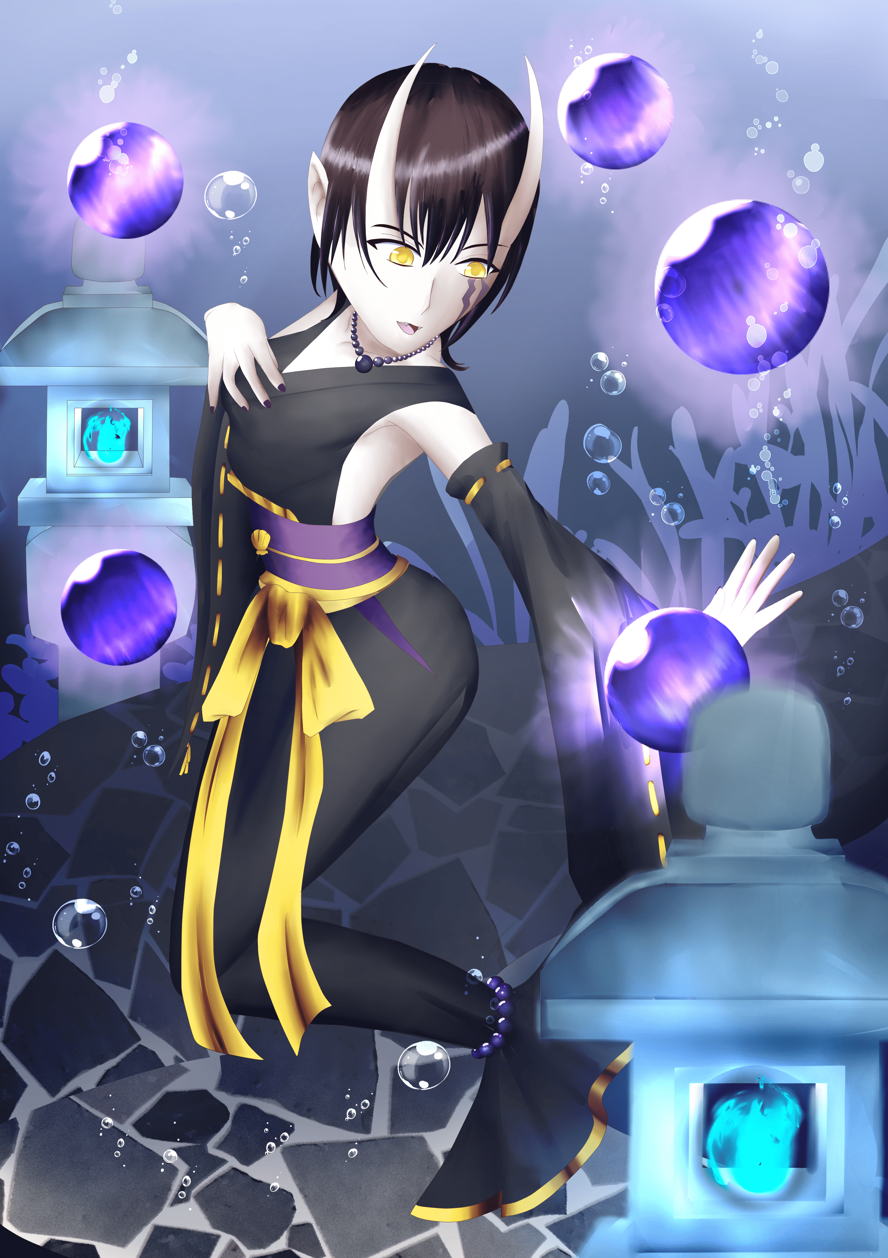 黒い巫女服みこふくを纏まもった人魚、彼女のまわりに浮遊ふゆうする五つの黒真珠くろしんじゅを自在に操り戦う。強い魔除けの力を持つ黒真珠くろしんじゅだけあって妖力も桁外けたはずれだという。